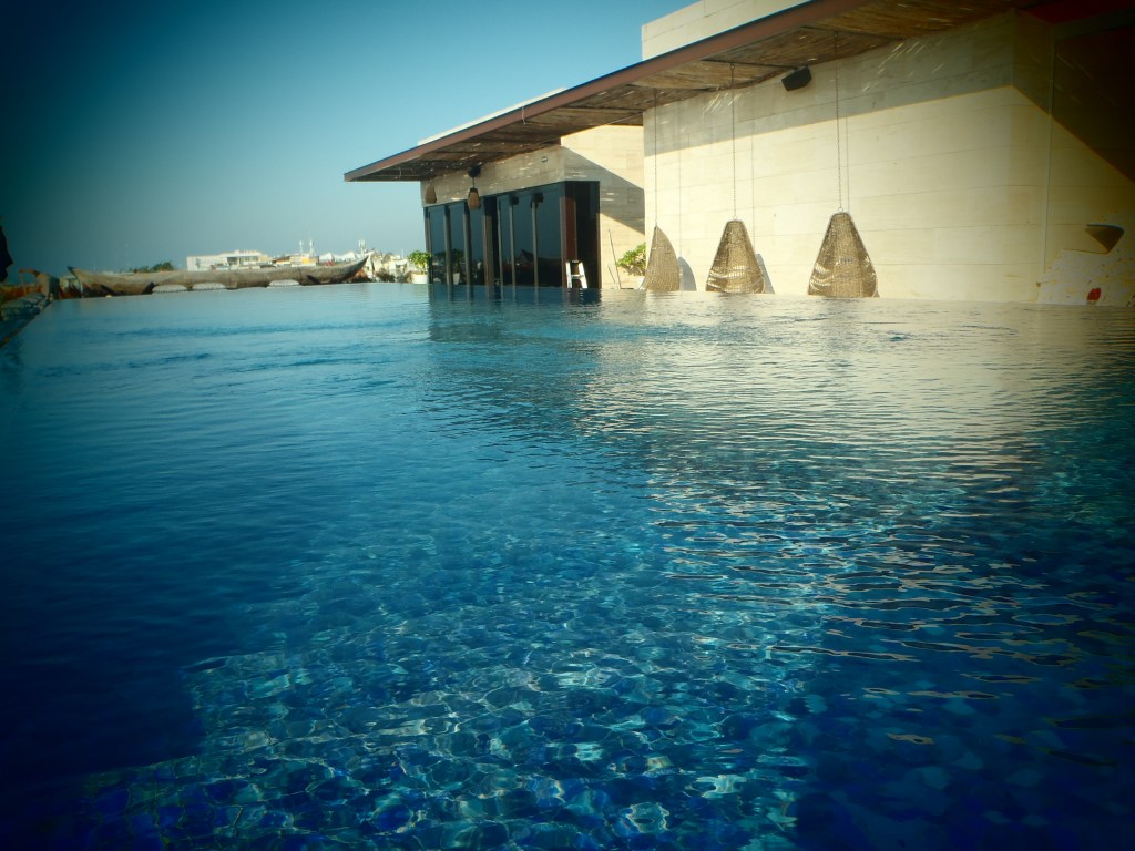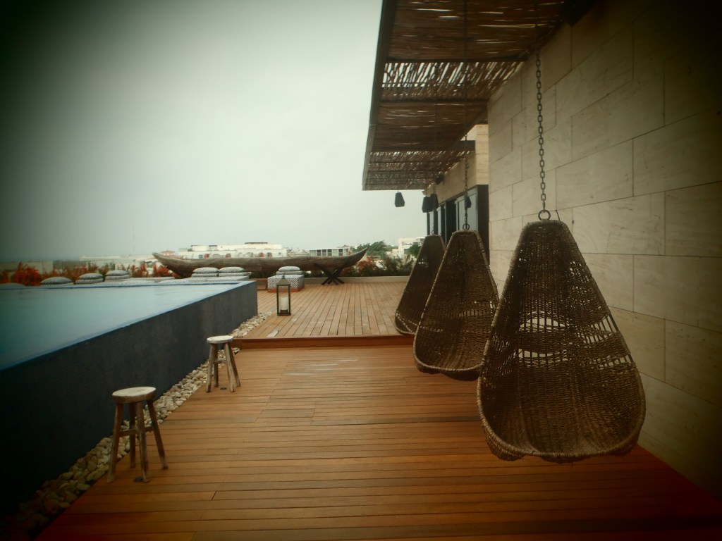 Première étape obligatoire : la piscine au lever du soleil. Tout y est désert. La lumière est fantastique. L’eau est à la bonne température. 3 fauteuils en osier suspendus y offrent un cocon protecteur qui semble idéal pour terminer de se réveiller. Rien de mieux qu’une régression tranquillisante pour commencer un voyage. Mais voilà, ils sont impraticables. Impossible de s’y assoir confortablement, avec ou sans coussin, jambes croisées, étendues ou pendantes, on y a le dos tordu et les bras coincés le long du corps.