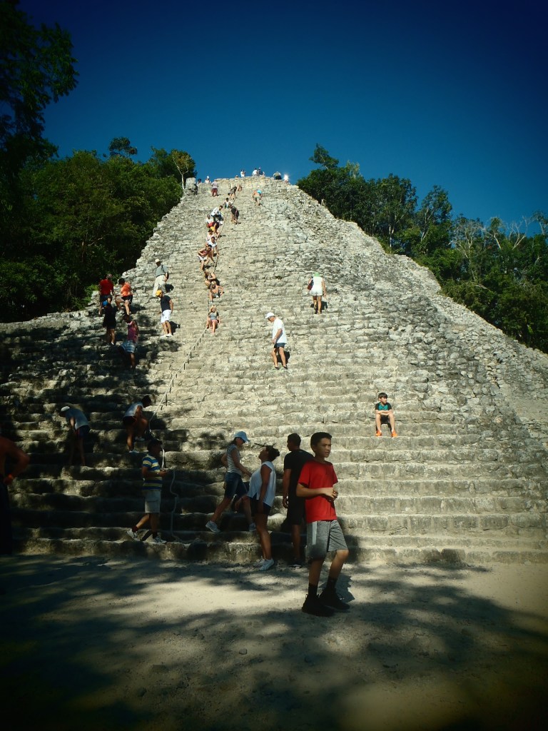 Au pays Maya, le tourisme commence par les pyramides. Les productions des civilisations anciennes sont toujours fascinantes même sous 40° et 80% d’humidité. Les ignames sont à la fête tandis que l’espèce homme-touriste souffre dans ces ruines sans ombres. Seul refuge rafraîchissant : la mer verte des caraïbes. Heureusement qu’elle est là, la sublime, l’accueillante, la transparente ! Mais comment faisaient les Mayas avec leurs plumes et leurs sacrifices humains par cette chaleur étouffante ! Aucun guide n’a de réponse à cette question qui me semble pourtant essentielle tant je transpire dans mon bikini.