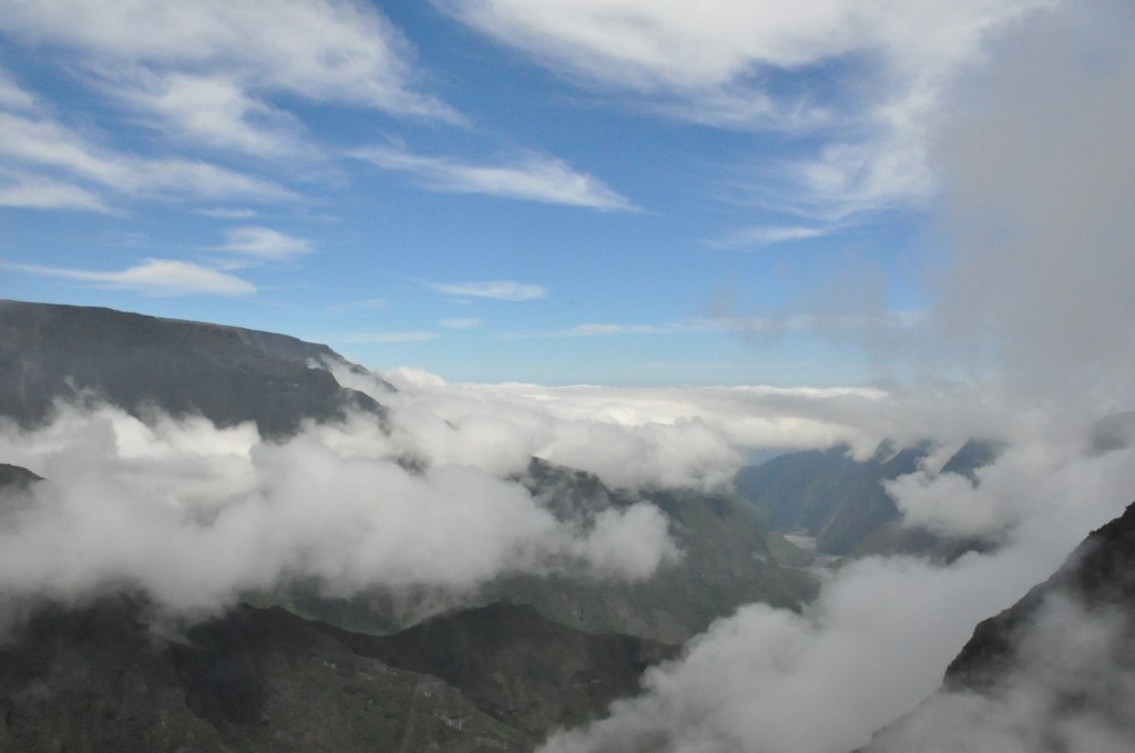 Ce matin nous sommes allés faire une balade sur les hauts vers le cirque de Cilaos. Dans balade comprendre marche de montagne abrupte de 4h en montant et descendant sous le vent, le ciel, le soleil et la pluie.