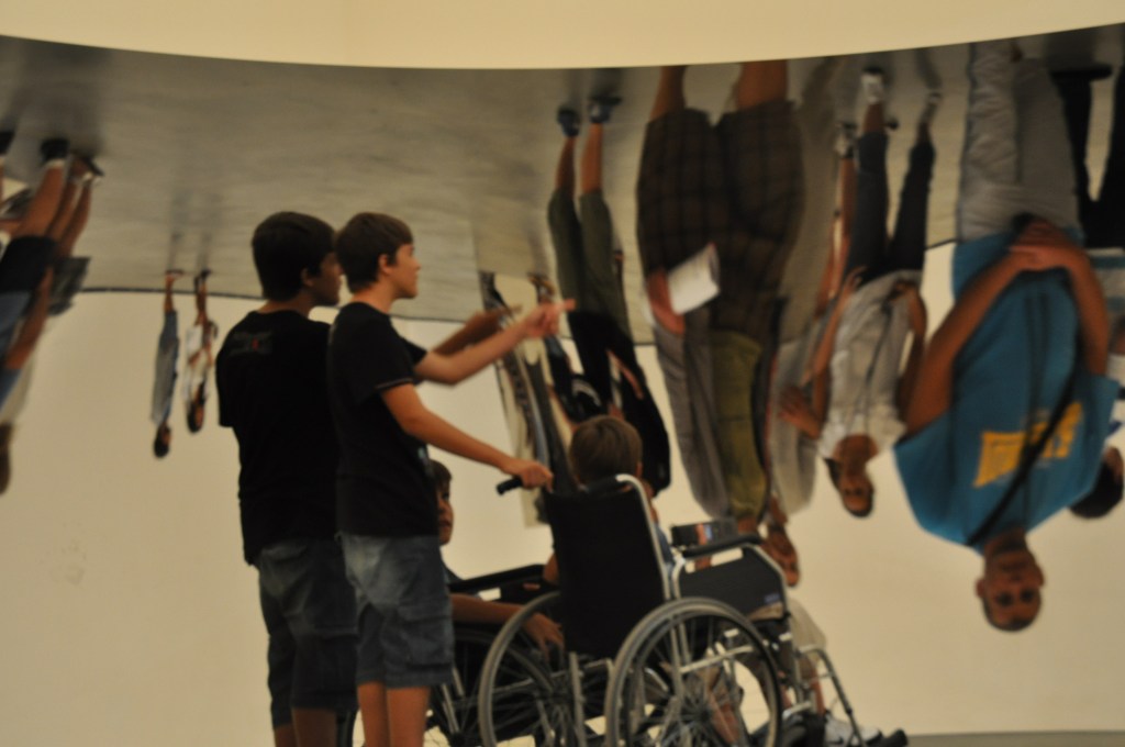 Mais voilà que d’un coup, la lumière et le ventilateur s’éteignent dans un puissant bruit de sous-marin. La peur s’empare des visiteurs qui cherchent à fuir. Les enfants crient, s’agrippent à leurs parents. La lumière stroboscopique qui passe du bleu au rouge et le grondement sourd des profondeurs empêchent les humains de s’entendre penser. Les groupes se sont tous reconstitués dans un réflexe de repli sur soi pendant que les parois en plastique s’écroulent sur elles-mêmes dans un bruit de froissement. S’ensuit un moment d’immobilité et de silence profond. On ne bouge plus. On attend en se tenant par la main, par le coude, par l’épaule. Et finalement, à peine quelques secondes plus tard, on se met à rire éloignant la gêne de la première stupeur. Alors, toujours plongé dans une ambiance sourde et une lumière intermittente, on s’avance lentement vers la sortie pour retrouver l’air libre de la grande verrière avant que l’ouverture ne soit totalement impraticable.