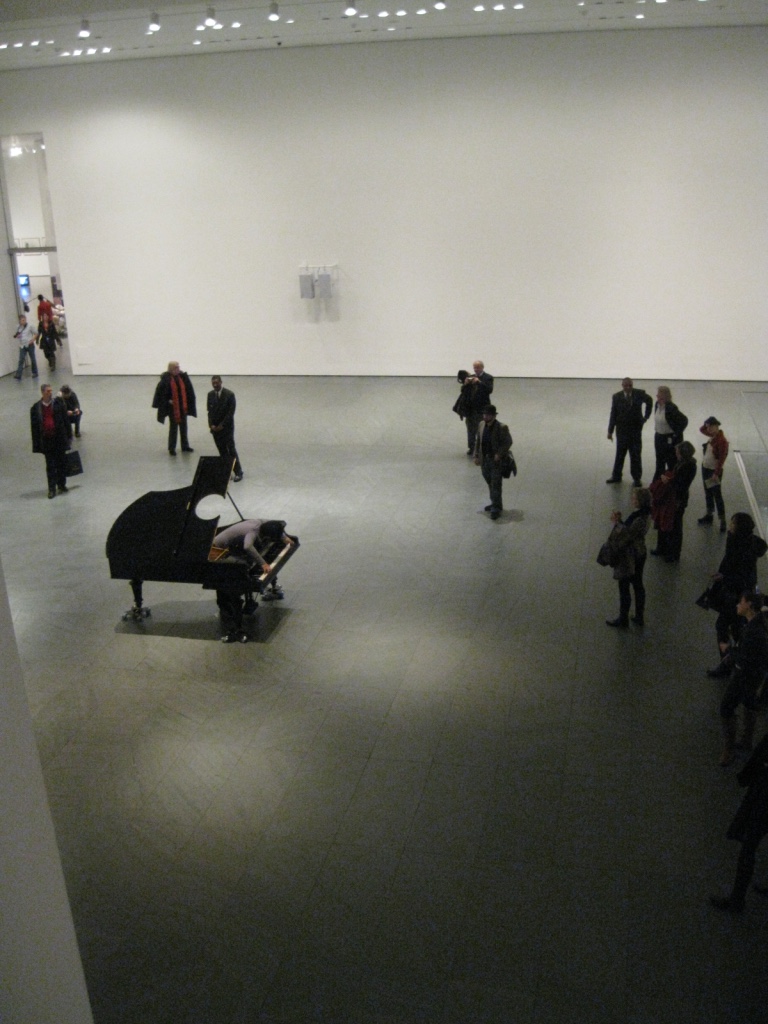 Pour le déjeuner, après le Guggenheim et en attendant la séance du vieux film américain à voir au MOMA, nous dégustons un Hamburger dans un restaurant certifié OK par le service d’hygiène (indication en clair sur la porte). Le hamburger fait 1044 calories, mais si on ajoute une double ration de frites c’est 350 calories de plus. Face au grand panneau indiquant les gestes qui sauvent en cas d’arrêt cardiaque, je me décide pour la double portion. Une douce culpabilité me prend. Aux toilettes, j’apprends que les employés doivent se laver les mains après avoir utilisé le lieu et que l’eau contient moins de 5% de javel.